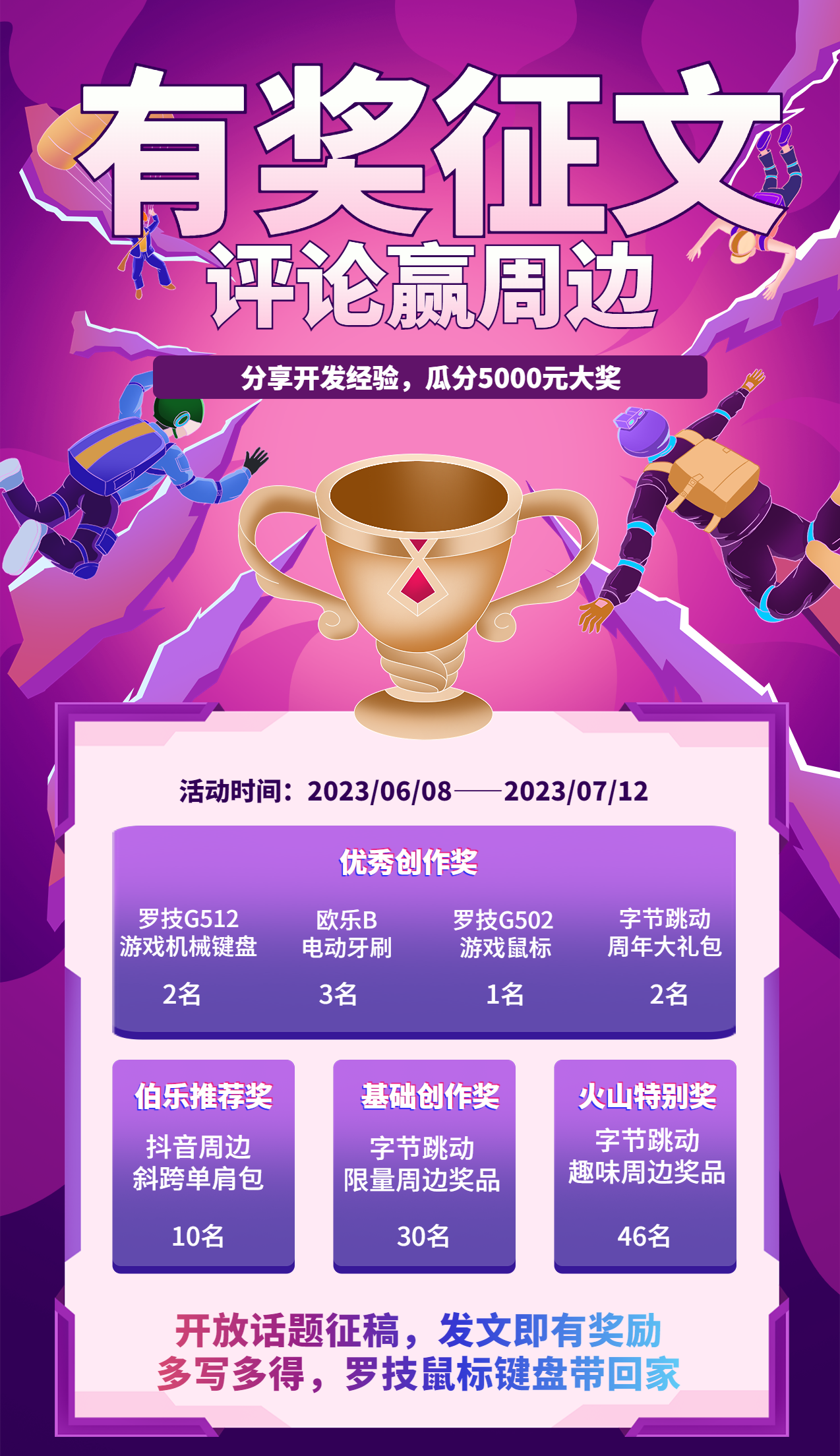 发文基础奖:写一篇也能拿周边! 活动期间,在抖音开放平台按照投稿要求完成规定格式和数量的内容创作即可获得对应的字节周边纪念品奖励;