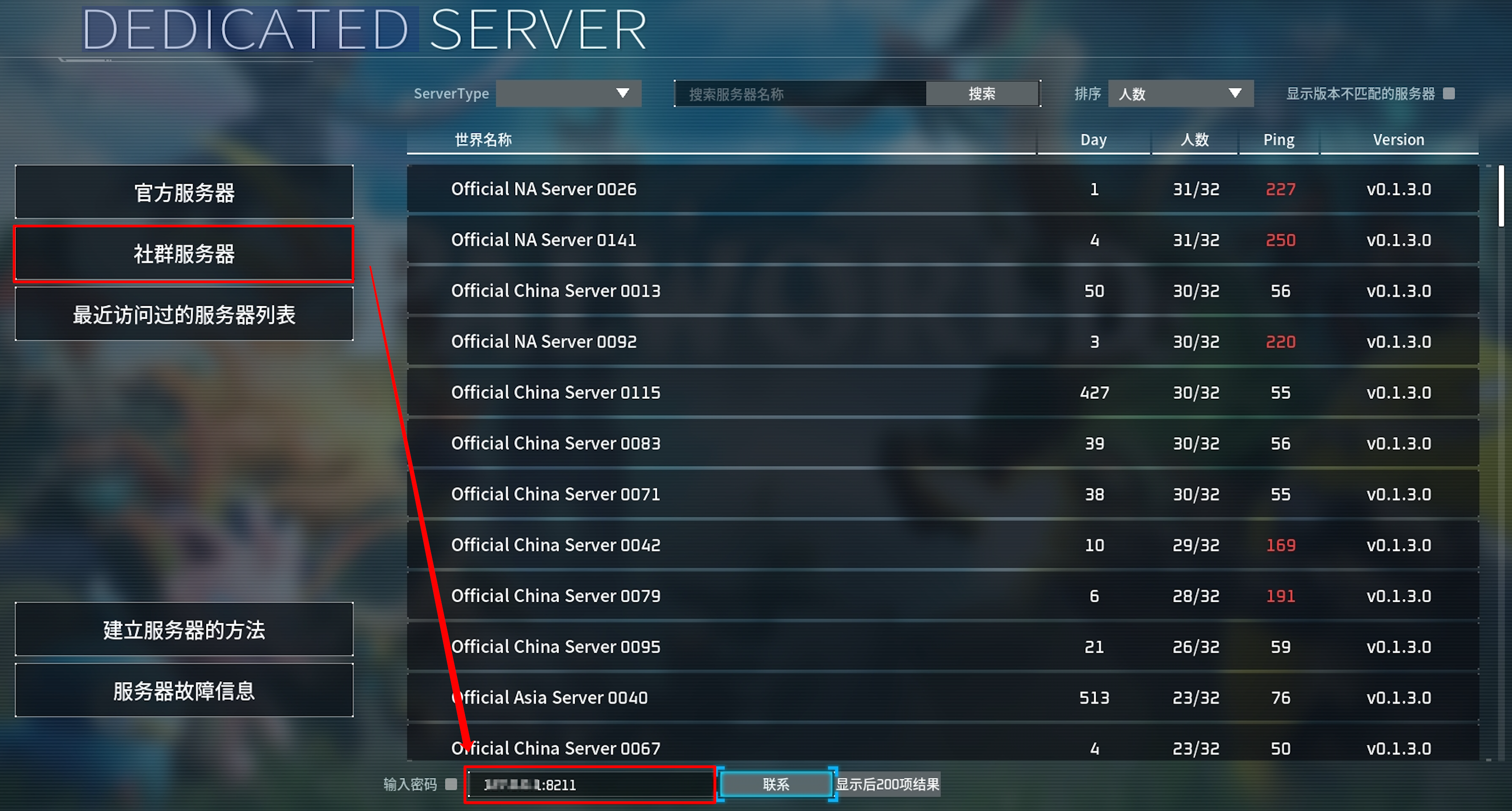 云服务器公网IP:8211,单击“联系”按钮即可进入专属服务器开始游戏。