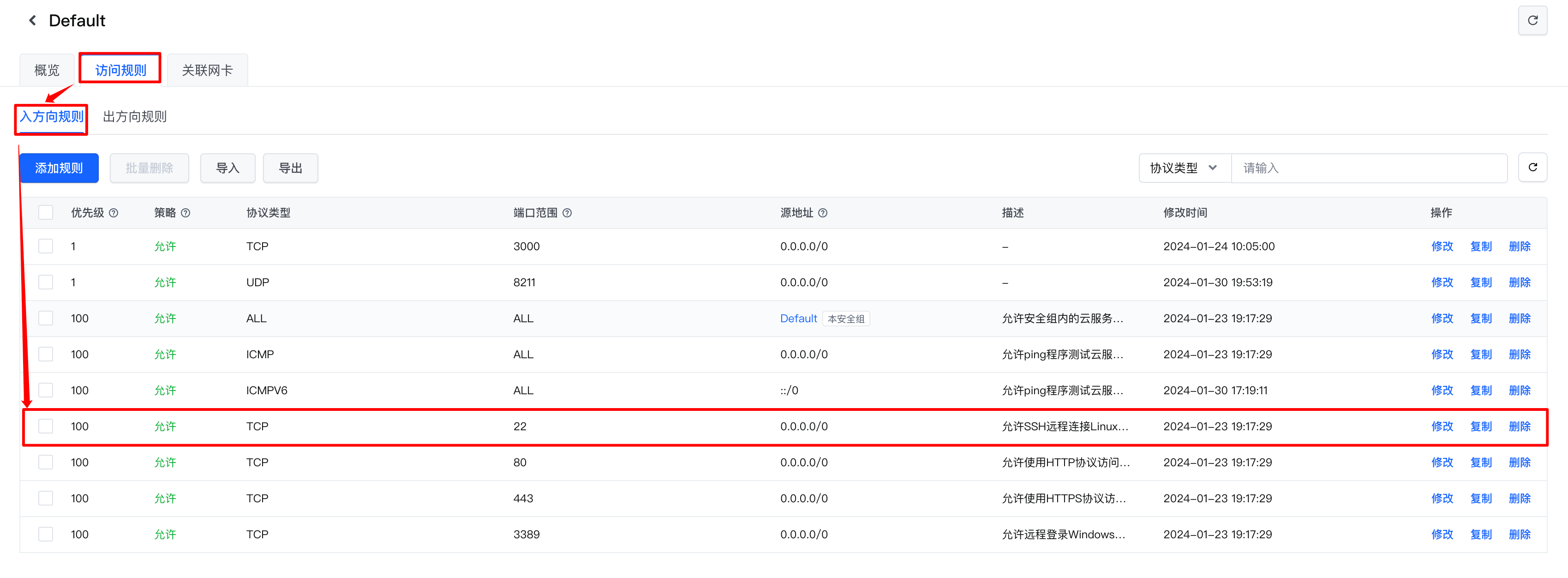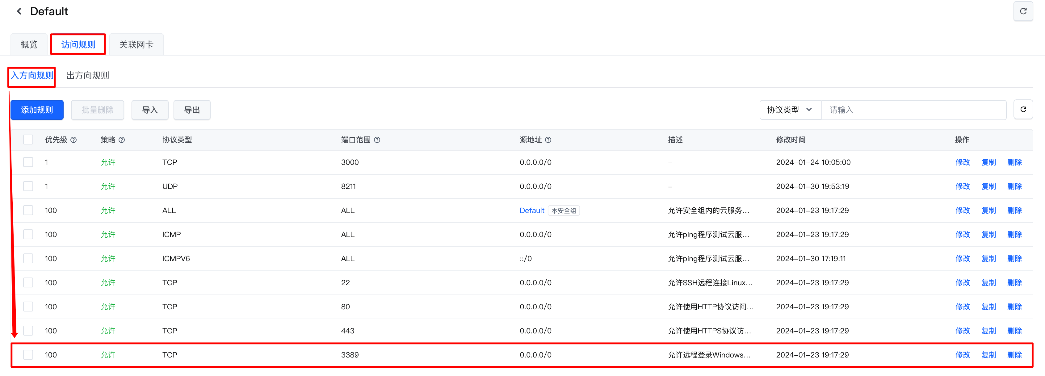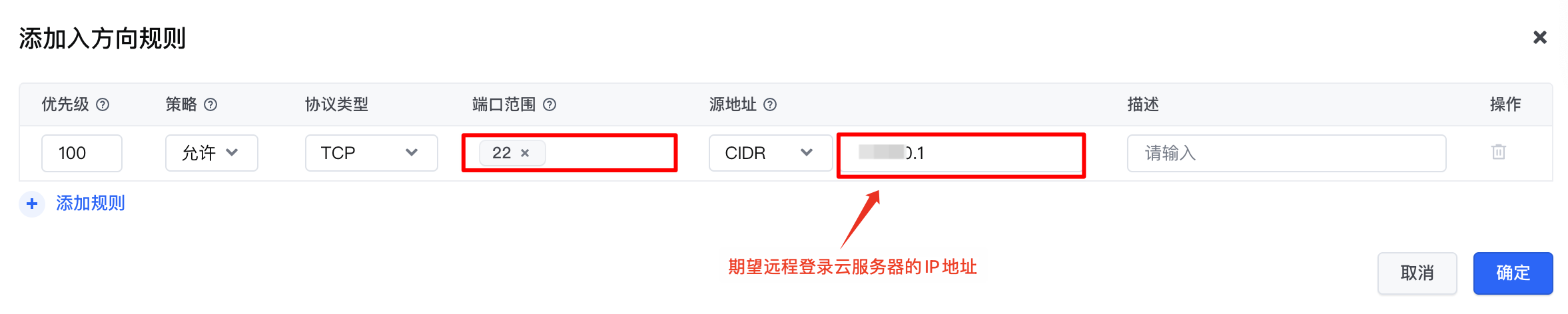 0.0.0.0/0修改为期望远程登录云服务器的IP地址。如需通过火山引擎控制台登录云服务器,“源地址”必须添加