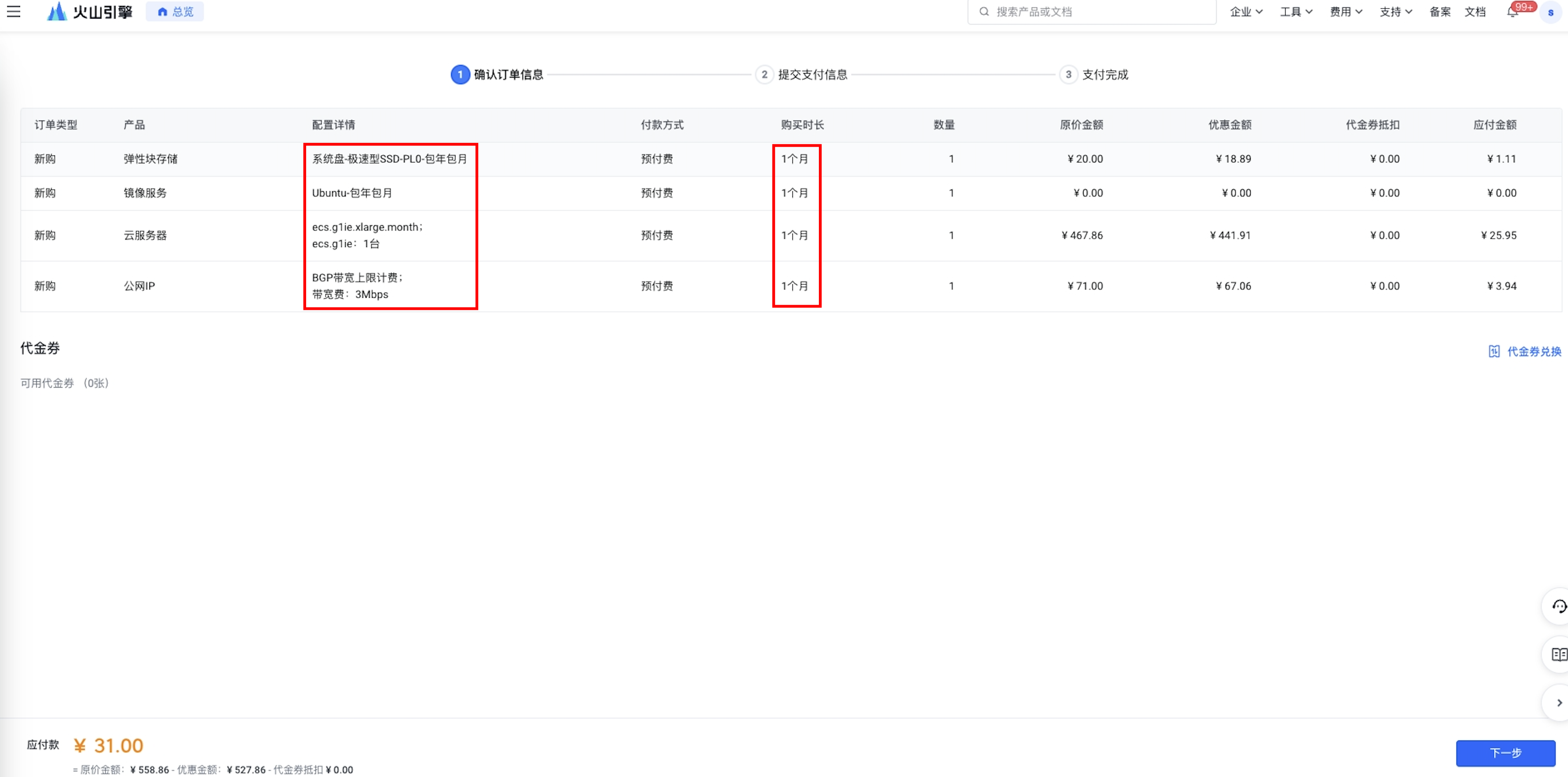 确认下单的云服务器需要付费的信息,单击“下一步”按钮。