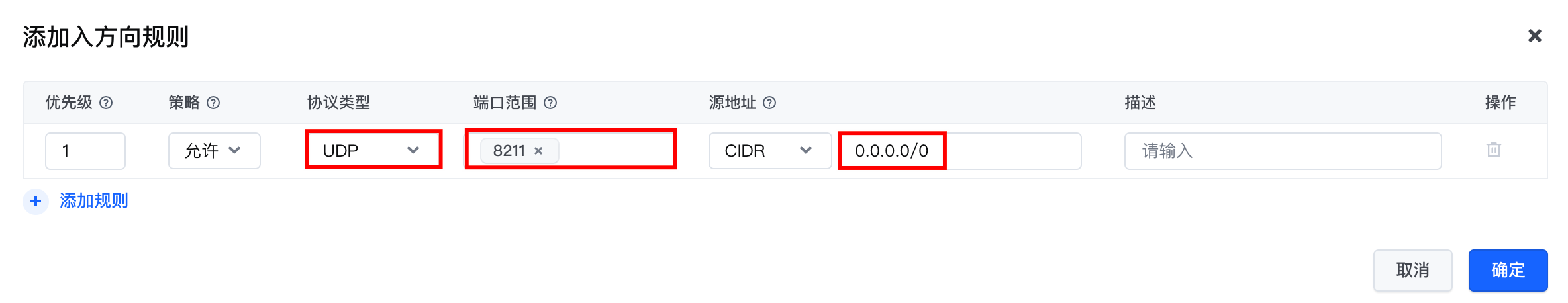UDP、“端口范围”为8211、“源地址”为0.0.0.0/0,单击“确定”按钮,完成配置。参考下图: