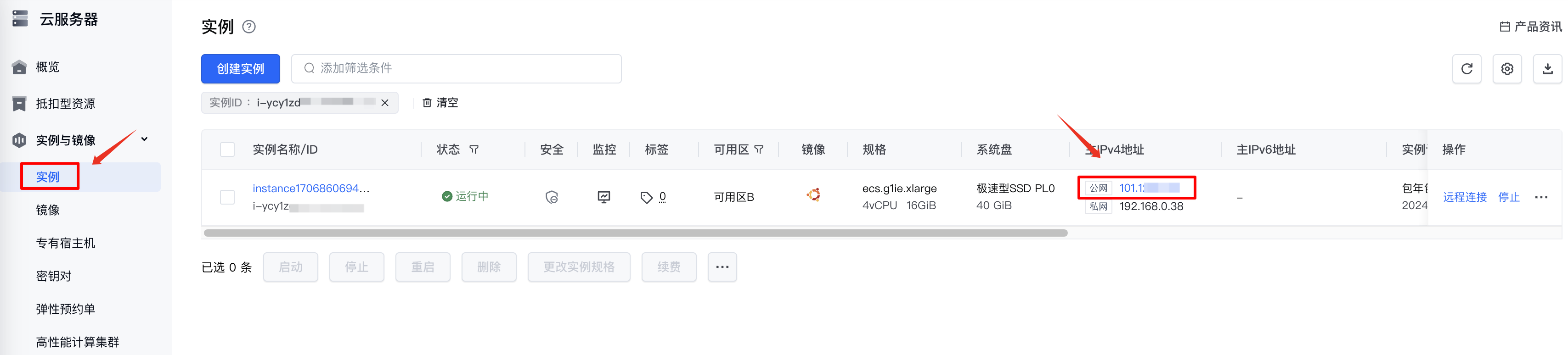 在左侧目录树选择“实例与镜像 > 实例”,通过实例ID搜索查找你购买的实例。
