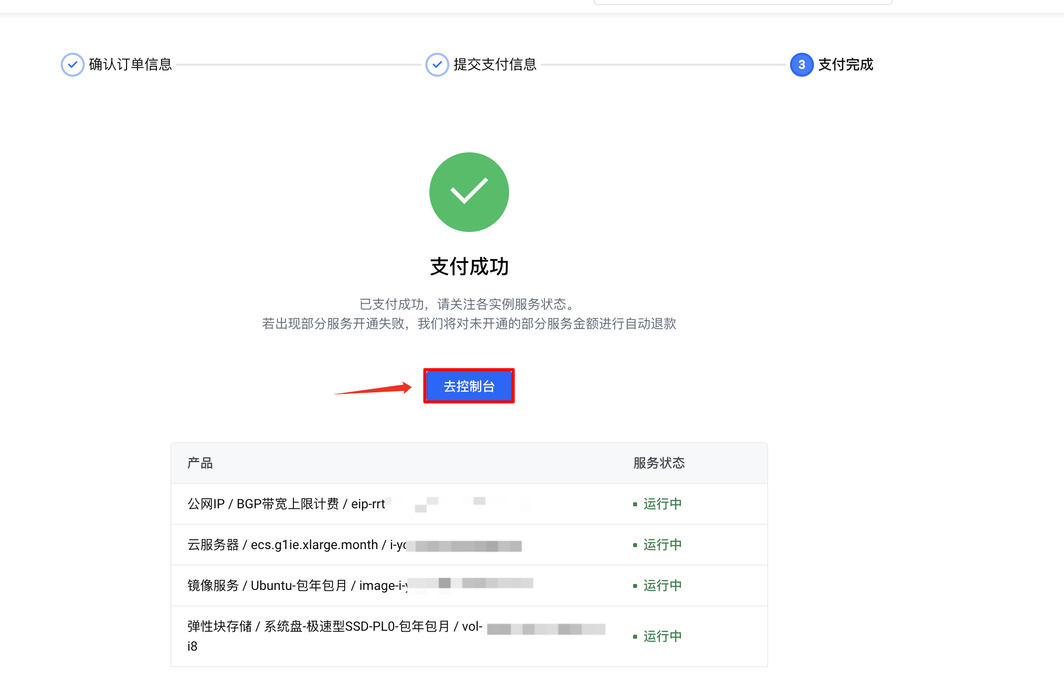 支付成功后,表示你已经成功购买了一台服务器。单击“去控制台”按钮。