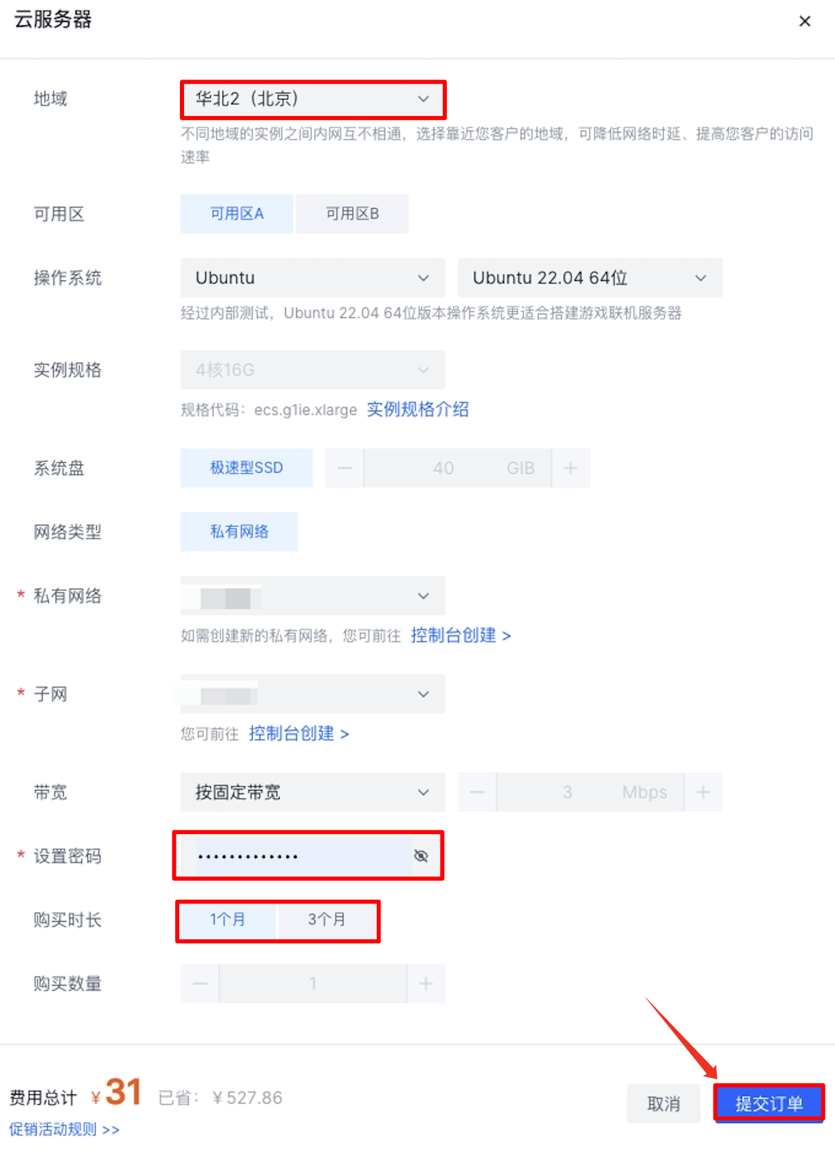 在右侧弹窗页面,配置如下内容(未提及的信息保持默认即可),单击“提交订单”按钮,提交购买申请。