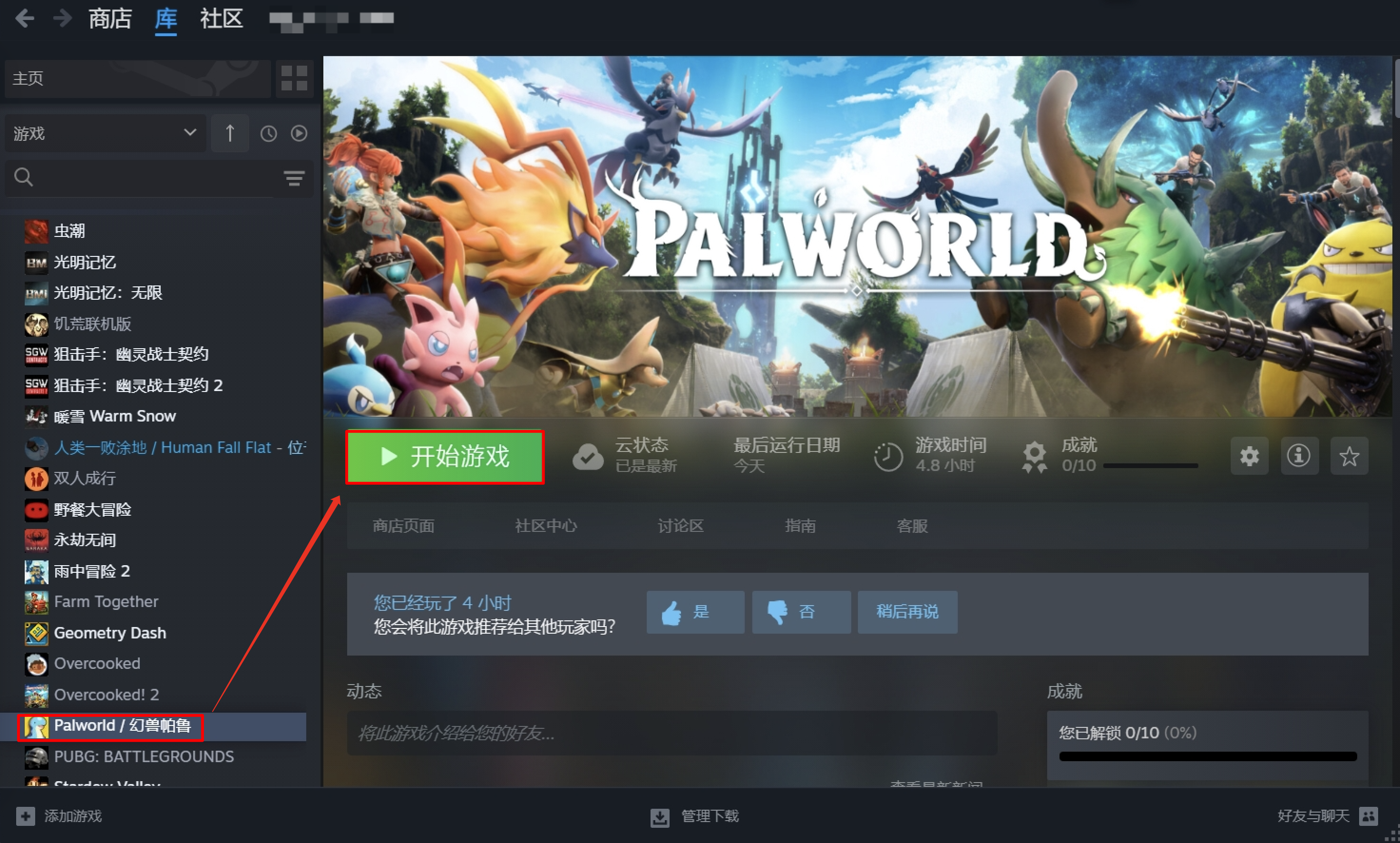 在你自己的电脑中启动Steam,并在游戏库中选中Palworld,单击“开始游戏”按钮启动游戏。