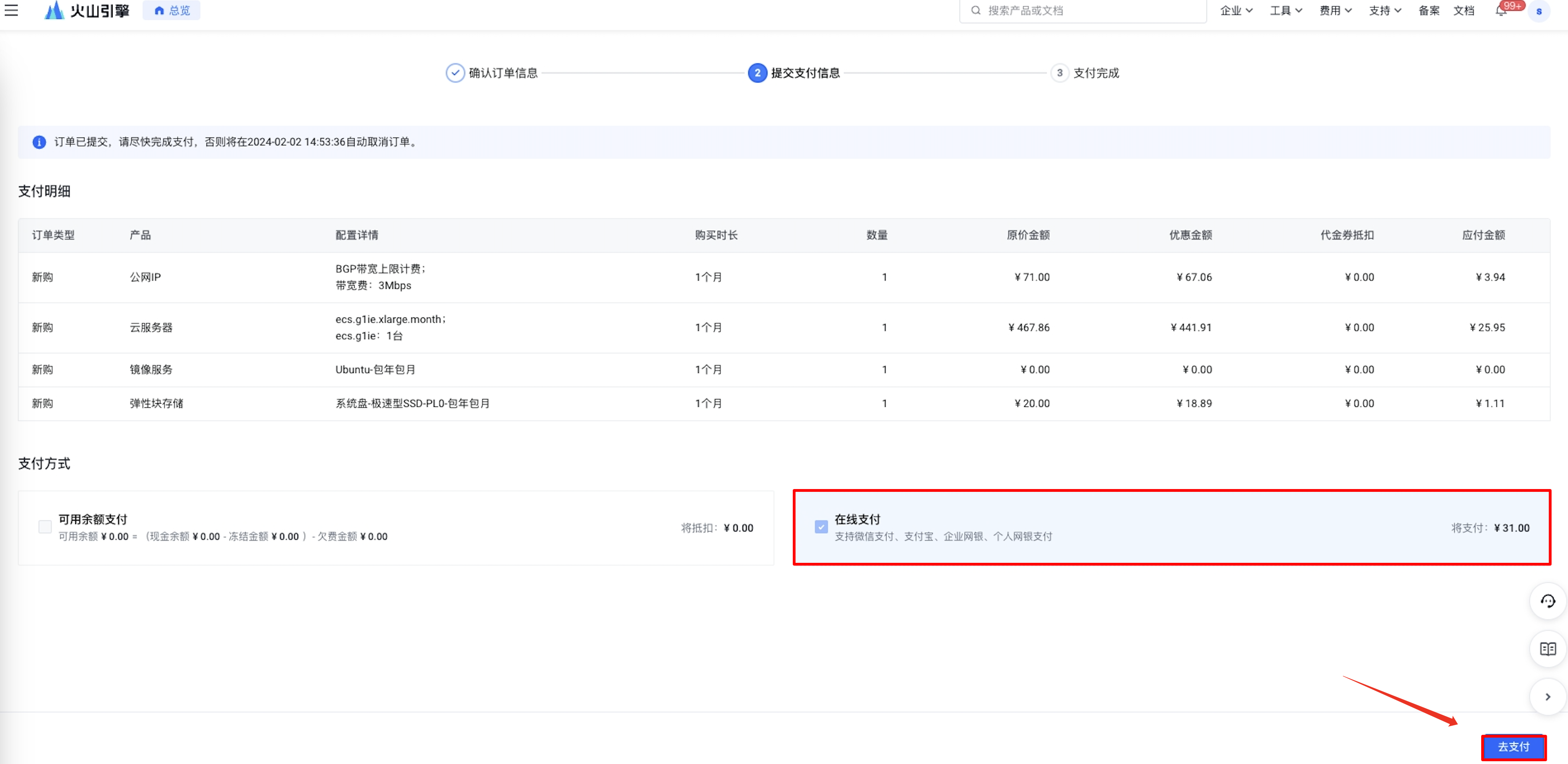选择“支付方式”,单击“去支付”按钮完成支付。