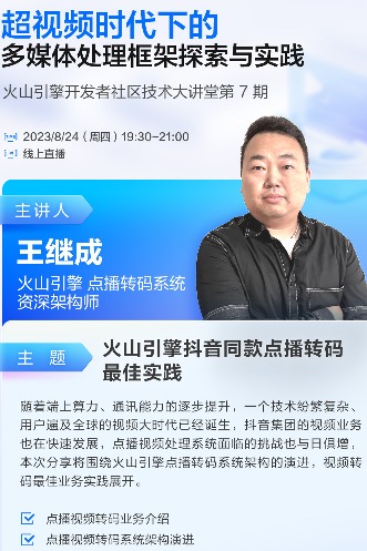 讲师简介: 王继成,火山引擎点播转码系统资深架构师,曾先后参与新浪微博点直播转码系统研发,x265编码器开发优化、GPU异构加速等工作,目前负责火山引擎点播视频转码系统研发工作。