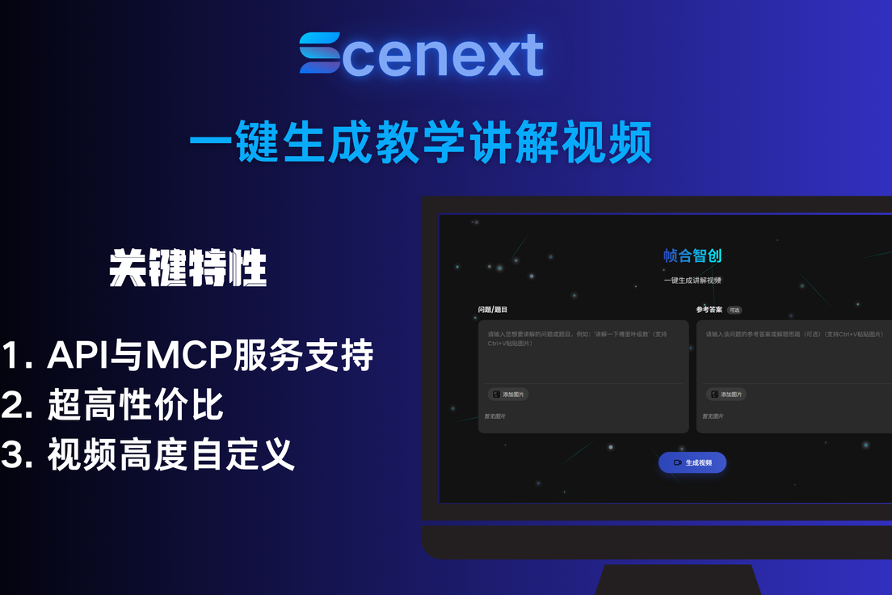 1、Scenext 是灵帧科技有限公司研发的一款AI产品,提供AI教学讲解视频生成服务,能够根据提供的问题自动生成高质量的讲解视频。教学视频通过服务异步生成,生成时长随题目难度变化,生成一个视频时长大约为5到20分钟。生成一个视频平均为3毛左右,比 VideoTutor更值!国内AI教学视频神器,用更低成本搞定优质教学视频。 Scenext 是国内的一个AI视频生成平台,能够根据提供的问题和参考答
