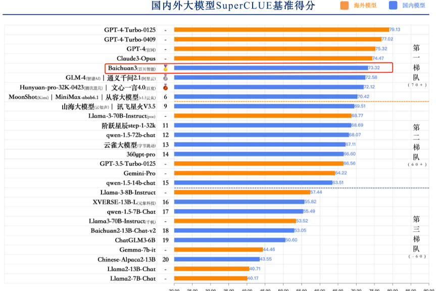 4月30日,国内权威大模型评测机构SuperCLUE发布了《中文大模型基准测评2024年度4月报告》,报告选取国内外具有代表性的32个大模型4月份的版本,通过多维度综合性测评,对国内外大模型发展现状进行观察与思考。报告显示,Baichuan 3在国内大模型中排名第一,以总分73.32的优异成绩超越文心一言4.0、通义千问2.1、GLM-4、Moonshot等大模型。SuperCLUE是国内权威的通