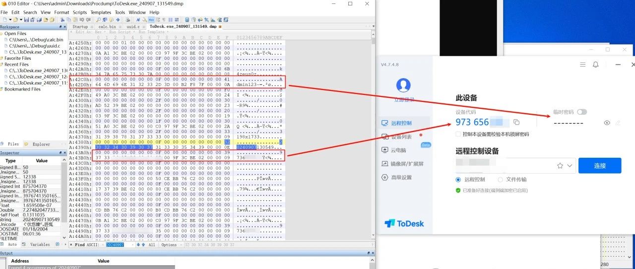测试版本:官网最新版4.7.4.8首先查看ToDesk进程PID这里存在两个ToDesk进程,我们选择非ToDesk_Service的PID将Dump下来的文件使用编辑器打开,直接搜索当前日期,今日是2024年9月7日,所以搜索20240907。找到一个长度为14位的字符串,该字符串规律:当前日期+重置密码次数(随机值累加),设备代码紧跟着这串长度14的字符串,图中也就是973656xxx,连接密