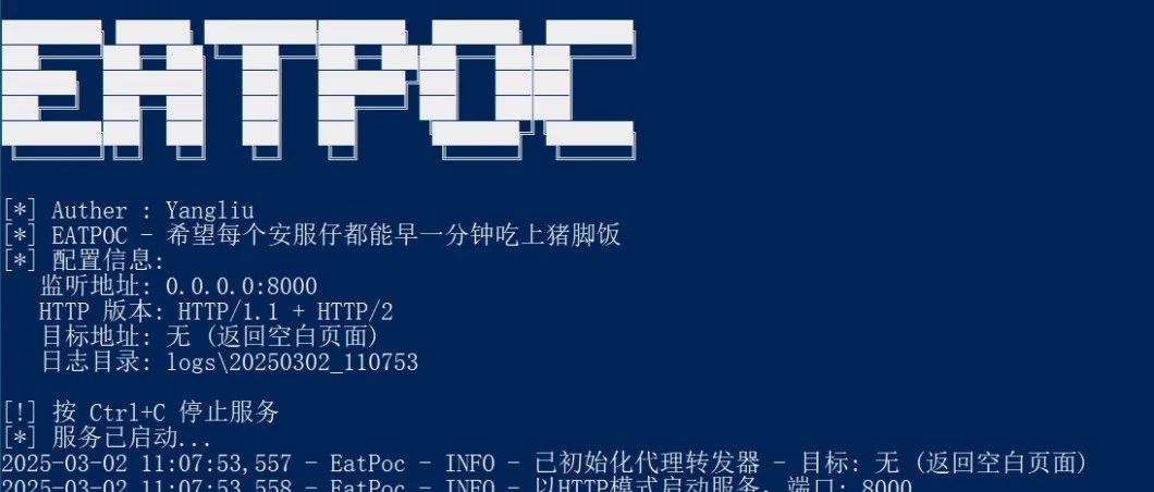 又到每年大小考的时候了,很多非开源扫描器会集中再这段时间疯狂推送新的POC。大秀肌肉。有时候不想启用mitmproxy去精细化抓取流量,只想批量保存POC。所以做了这么一个脚本去完成需求。**该工具保存经过的流量(request),可以再用大模型修改格式,比如改成Nuclei支持的格式。**项目地址简介EatPoc是一个简单的模拟mitmproxy功能的HTTP请求捕获、记录和转发工具。该工具全程